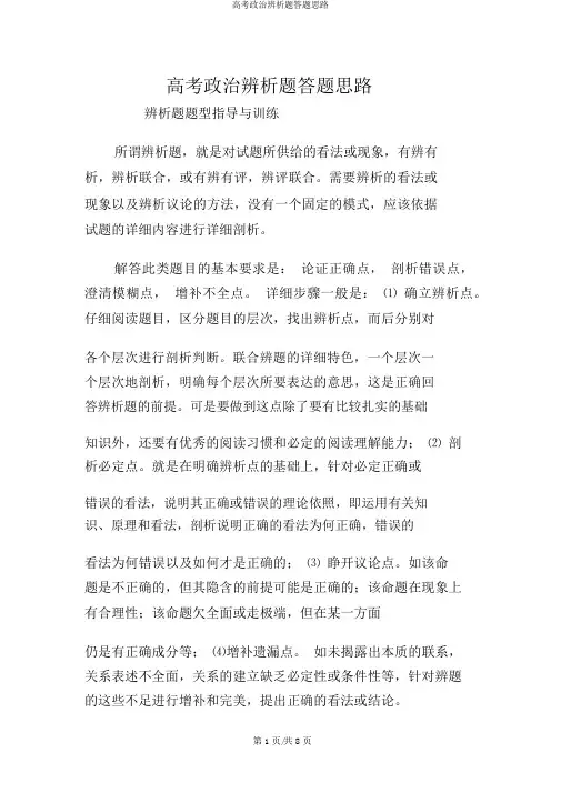 高考政治辨析题答题思路辨析题题型指导与训练所谓辨析题,就是对试题所供给的看法或现象,有辨有析,辨析联合,或有辨有评,辨评联合。