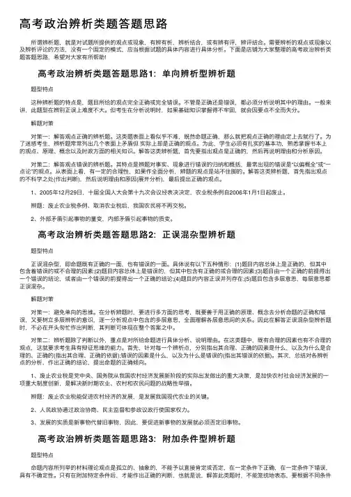 三、应答策略1. 平衡观点思想政治辨析题通常会涉及到不同的观点和论点,要在回答问题时做到平衡观点,既可以对各个观点进行辨析和分析,也可以发表自己的观点。