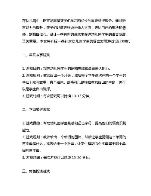 2. 语言游戏活动的意义语言游戏活动在幼儿园中具有重要的意义,主要体现在以下几个方面: 2.1 激发幼儿学习兴趣通过设立丰富多样的语言游戏活动,可以激发幼儿对语言学习的兴趣,增加幼儿的学习动力,使他们在欢乐的氛围中享受学习。