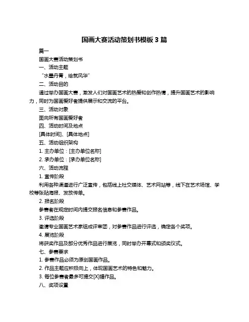 国画大赛活动策划书模板3篇篇一国画大赛活动策划书一、活动主题“水墨丹青,绘就风华”二、活动目的通过举办国画大赛,激发人们对国画艺术的热爱和创作热情,提升国画艺术的影响力,同时为国画爱好者提供展示和交流的平台。