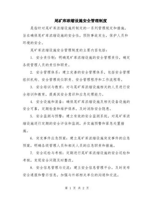 尾矿库浓缩设施安全管理制度第一章总则第一条为了加强企业尾矿库浓缩设施的安全管理,确保生产过程中不发生事故,并保障员工的生命安全与身体健康,本制度订立。