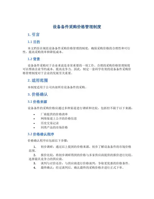 设备备件采购价格管理制度1. 引言1.1 目的本文档旨在规范设备备件采购价格管理的制度,确保采购价格的合理性和可行性,提高采购效率和降低成本。