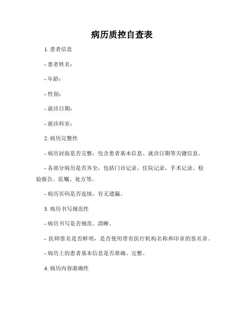 病历质控自查表1. 患者信息- 患者姓名:- 年龄:- 性别:- 就诊日期:- 就诊科室:2. 病历完整性- 病历封面是否完整,包含患者基本信息、就诊日期等关键信息。