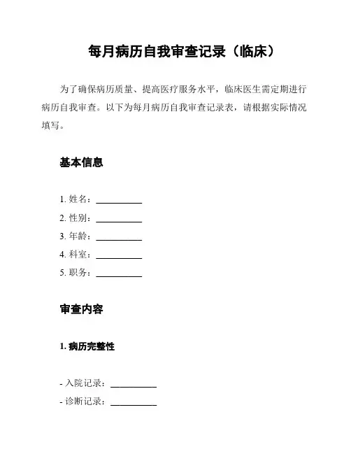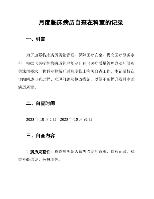 月度临床病历自查在科室的记录一、引言为了加强临床病历质量管理,保障医疗安全,提高医疗服务水平,根据《医疗机构病历管理规定》和《医疗质量管理办法》等相关法规要求,我科室积极开展月度临床病历自查工作。
