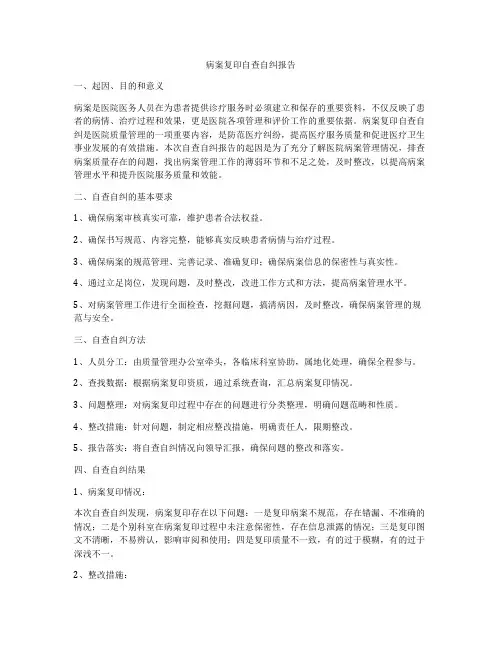 病案复印自查自纠报告一、起因、目的和意义病案是医院医务人员在为患者提供诊疗服务时必须建立和保存的重要资料,不仅反映了患者的病情、治疗过程和效果,更是医院各项管理和评价工作的重要依据。