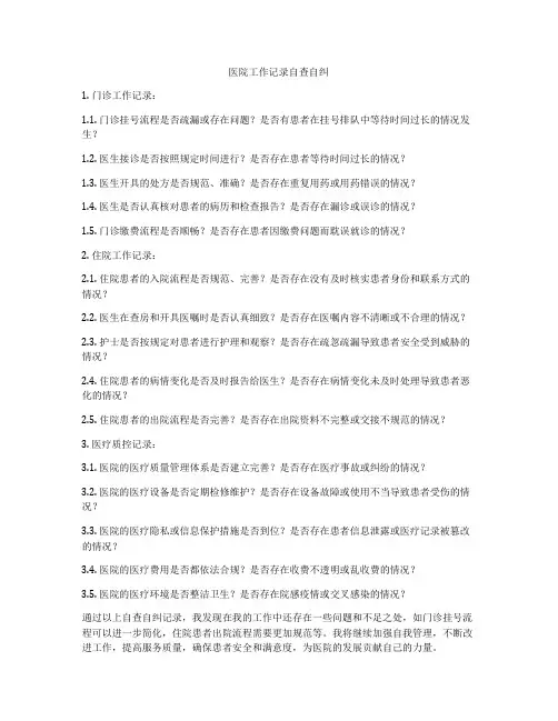 医院工作记录自查自纠1. 门诊工作记录:1.1. 门诊挂号流程是否疏漏或存在问题?是否有患者在挂号排队中等待时间过长的情况发生?1.2. 医生接诊是否按照规定时间进行?是否存在患者等待时间过长的情况?1.3. 医生开具的处方是否规范、准确?是否存在重复用药或用药错误的情况?1.4. 医生是否认真核对患者的病历和检查报告?是否存在漏诊或误诊的情况?1.5. 门诊缴费流程是否顺畅?是否存在患者因缴费问题而耽误就诊的情况?2. 住院工作记录:2.1. 住院患者的入院流程是否规范、完善?是否存在没有及时核实患者身份和联系方式的情况?2.2. 医生在查房和开具医嘱时是否认真细致?是否存在医嘱内容不清晰或不合理的情况?2.3. 护士是否按规定对患者进行护理和观察?是否存在疏忽疏漏导致患者安全受到威胁的情况?2.4. 住院患者的病情变化是否及时报告给医生?是否存在病情变化未及时处理导致患者恶化的情况?2.5. 住院患者的出院流程是否完善?是否存在出院资料不完整或交接不规范的情况?3. 医疗质控记录:3.1. 医院的医疗质量管理体系是否建立完善?是否存在医疗事故或纠纷的情况?3.2. 医院的医疗设备是否定期检修维护?是否存在设备故障或使用不当导致患者受伤的情况?3.3. 医院的医疗隐私或信息保护措施是否到位?是否存在患者信息泄露或医疗记录被篡改的情况?3.4. 医院的医疗费用是否都依法合规?是否存在收费不透明或乱收费的情况?3.5. 医院的医疗环境是否整洁卫生?是否存在院感疫情或交叉感染的情况?通过以上自查自纠记录,我发现在我的工作中还存在一些问题和不足之处,如门诊挂号流程可以进一步简化,住院患者出院流程需要更加规范等。
