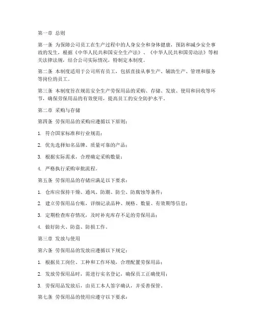 第三条本制度旨在规范安全生产劳保用品的采购、存储、发放、使用和回收等环节,确保劳保用品的有效使用,提高员工的安全防护水平。