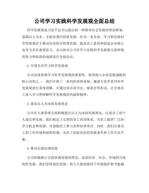 企业学习实践科学发展观心得体会企业学习实践科学发展观是指企业在发展过程中,始终遵循科学发展观的理念和原则,在实践中不断学习和积累经验,以实现可持续发展。