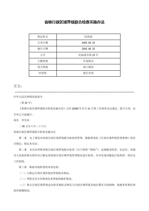 国务院勘界工作领导小组关于印发《勘定省级行政区域界线总体方案》的通知正文:---------------------------------------------------------------------------------------------------------------------------------------------------- 国务院勘界工作领导小组关于印发《勘定省级行政区域界线总体方案》的通知(国勘发[1996]4号1996年3月1日)各省、自治区、直辖市人民政府:根据国务院关于开展全面勘界工作的决定和全国勘界工作会议的统一部署,制定了《勘定省级行政区域界线总体方案》。