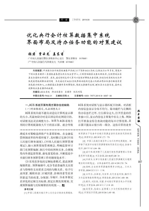 中央银行会计集中核算系统存在的问题及优化建议“中央银行会计集中核算系统”(以下简称ABS系统)使用至今,经过多次修改和升级,功能已经相对完善,但是在实际运行过程中,仍然存在一些问题亟待改进。