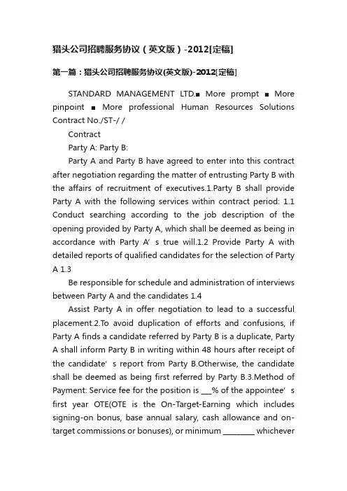 猎头公司招聘服务协议(英文版)-2012[定稿]第一篇:猎头公司招聘服务协议(英文版)-2012[定稿]STANDARD MANAGEMENT LTD.■ More prompt ■ More pinpoint ■ More professional Human Resources Solutions Contract No./ST-/ /ContractParty A: Party B:Party A and Party B have agreed to enter into this contract after negotiation regarding the matter of entrusting Party B with the affairs of recruitment of executives.1.Party B shall provide Party A with the following services within contract period: 1.1 Conduct searching according to the job description of the opening provided by Party A, which shall be deemed as being in accordance with Party A’s true will.1.2 Provide Party A with detailed reports of qualified candidates for the selection of Party A 1.3Be responsible for schedule and administration of interviews between Party A and the candidates 1.4Assist Party A in offer negotiation to lead to a successful placement.2.T o avoid duplication of efforts and confusions, if Party A finds a candidate referred by Party B is a duplicate, Party A shall inform Party B in writing within 48 hours after receipt of the candidate’s report from Party B.Otherwise, the candidate shall be deemed as being first referred by Party B.3.Method of Payment: Serv ice fee for the position is ___% of the appointee’s first year OTE(OTE is the On-Target-Earning which includes signing-on bonus, base annual salary, cash allowance and on-target commissions or bonuses), or minimum _________ whicheveris greater.Party A shall pay the first installment of __________ upon entering into this contract as the priority fee for Party B, the balance shall be paid within 7 days from the date of candidate’s being on board.Party A shall inform Party B of the appointee’s first year OTE upon Party B’s request.Any replacements will only be made on condition that our fees and any other outstanding accounts have been settled in full on time.Expenses relating to these assignments approved in advance by Party A will be billed at actual cost.4.Party B shall recommend other candidates according to Party A’s request provided that the candidate already placed gets dismissed within probation period of 3 months, except that such severance is due to Party A’s restructure or Party A’s breach of employm ent contract with the candidate.5.During the effective period of this contract, Party B shall not approach Party A’s existing employees by offering any outside job opportunities.6.The candidate who has been referred by Party B to Party A, or any other candidates referred by the candidate from his/her interview with Party A, shall be deemed as a valid candidate of Party B within twelve months from the first referral date.If Party A 1employ the candidate, during this period even if in private without via Party B, Party B shall still have the right to demand Party A to pay the service fee in full.Party A also shall not recommend the candidate to any third party without written consent of Party B.7.Party A shall be responsible for the employment contract of the candidate as well as the registration of such contract with the competent government labor department.Party A shall also pay the service fee to Party B on time.For any default in the payment, Party B shall have the right to demand Party A to further pay overdue fine at the rate of 1%of the total amount per day.8.Neither of the parties shall release information of the other party or of the candidate to a third party.9.If for any reason, Party A decide to cancel the assignment during the effective period of this contract, Party B’s charges will consist of fees and expenses incurred only to the date of termination.10.Through understanding of Party A, Party B can opportunistically inform party A of the availability of uniquely qualified talent with detailed resume even when there is no formal assignment.Successful placements in such cases can also be settled according to this contract.11.Interview by Party A of any candidate referred by Party B will be deemed acceptance in full of the above terms and conditions even beyond the effective period of this contract.12.This contract shall take effect upon signature, and any modification shall be made in writing with agreement of both parties.It can be terminated by a one-month advance notice in writing from either party and all the outstanding accounts must be settled before termination.This contract has two copies, each party holds a copy, both being equally valid.Party A: Party B:Signature: Signature:第二篇:猎头公司服务协议猎头公司服务协议甲方:________联系人:电话:乙方:_______ 联系人:电话:1.公司指定根据本合同协议和条款,乙方委托并指定甲方为乙方提供本合同规定的各项咨询服务。