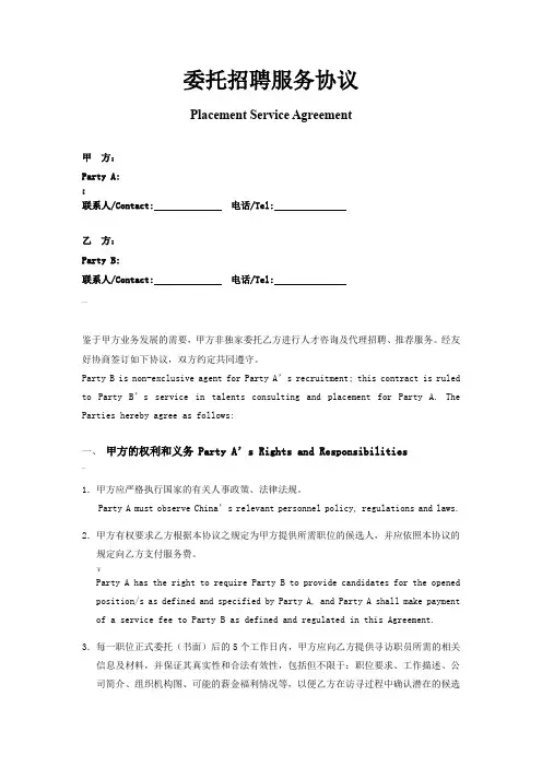 委托招聘服务协议Placement Service Agreement甲方:Party A:[联系人/Contact: 电话/Tel:乙方:Party B:联系人/Contact: 电话/Tel:—鉴于甲方业务发展的需要,甲方非独家委托乙方进行人才咨询及代理招聘、推荐服务。
