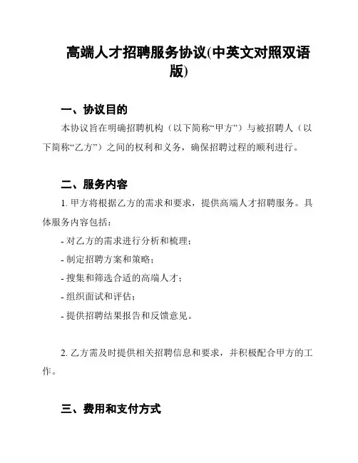 高端人才招聘服务协议(中英文对照双语版)一、协议目的本协议旨在明确招聘机构(以下简称“甲方”)与被招聘人(以下简称“乙方”)之间的权利和义务,确保招聘过程的顺利进行。