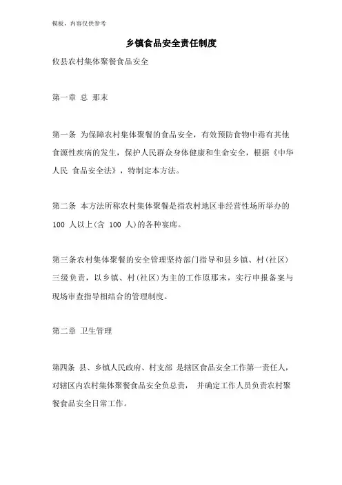 乡镇食品安全责任管理制度第一章总则第一条为了加强乡镇食品安全管理,保障人民群众的身体健康和生命安全,根据《中华人民共和国食品安全法》等法律法规,制定本制度。