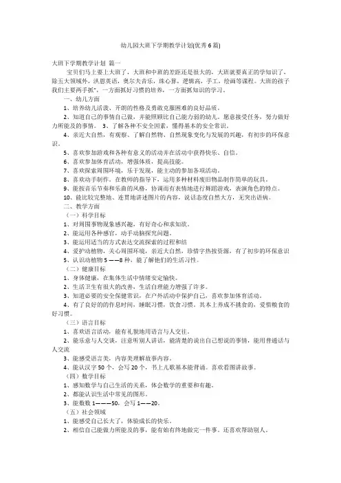 2021年第二学期幼儿园大班教学教学工作计划4篇第二学期幼儿园大班教学教学工作计划篇1一、大班健康教学活动目标(一)身体锻炼目标1、保持对体育活动的浓厚兴趣,乐于和同伴一起进行身体锻炼及游戏,具备一定的合作能力。
