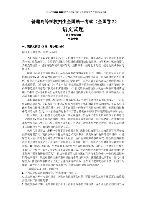 2018年高考试题真题——语文(新课标全国卷Ⅰ(1)) Word版含详细答案解析2018年普通高等学校招生全国统一考试语文试题注意事项:1.请考生在答题卡上填写姓名和座位号。