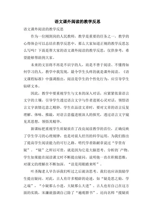 语文课外阅读的教学反思语文课外阅读的教学反思作为一位刚到岗的人民教师,教学是重要的任务之一,教学的心得体会可以总结在教学反思中,那么大家知道正规的教学反思怎么写吗?下面是帮大家的语文课外阅读的教学反思,仅供参考,希望能够帮助到大家。