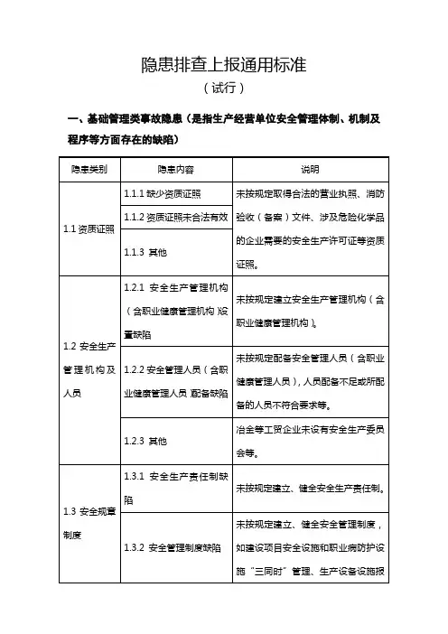隐患排查上报通用标准一、基础管理类事故隐患(是指生产经营单位安全管理体制、机制及程序等方面存在的缺陷)隐患类别隐患内容说明1.1资质证照未按规定取得合法的营业执照、消防验收(备案)文件、涉及危险化学品的企业需要的安全生产许可证等资质证照。