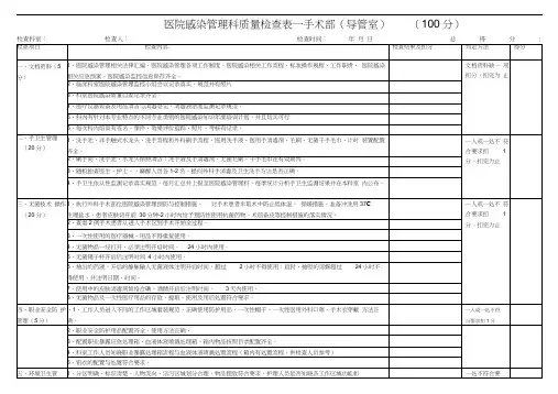 三、检查内容和指标1.空气洁净度–外科手术室内的空气洁净度–手术室换气和气流控制情况–空气负压隔离间内的空气洁净度2.物品消毒–手术器械消毒情况–手术间椅子、手术台等物品的消毒情况–清洁剂和消毒剂的使用和存储情况3.感染管理制度–手术室感染管理制度的建立和执行情况–感染预防与控制的培训和教育情况–感染监测和报告情况4.医务人员行为–医务人员穿戴是否符合手术室要求–医务人员手卫生操作是否规范–医务人员对患者隔离和感染控制的意识和行为5.废物处理–废物分类、存储和处理情况–感染性废物的处理是否符合规范标准四、评分标准根据检查内容和指标,制定以下评分标准:•优秀:符合要求,没有发现问题,得分满分•良好:大部分符合要求,个别问题存在但不影响整体质量,得分较高•一般:存在问题,需要进行改进和整改,得分较低•不合格:严重违反要求,需要立即整改,并进行事后处理,得分为零五、检查流程1.预检查准备:–准备检查表格、记录表和必要的工具设备–安排检查人员和时间–向手术室负责人通报检查计划和流程2.实地检查:逐项按照检查内容和指标,使用检查表格进行检查,记录相关情况和问题。
