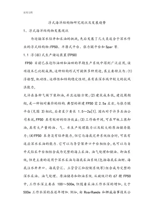 浮式海洋结构物研究现状及发展趋势1、浮式海洋结构物发展现状为迎接深水钻井和采油的挑战,先后发展了几大类适合于深水作业的浮式结构物:FPSO、半潜式平台、张力腿平台和Spar等.1.1 浮(船)式生产储运装置(FPSO)FPSO目前已在边际油田和油田的早期生产系统中得到广泛应用,该项技术已比较成熟,这种结构形式可提供多种用途,其主要特点为:(1)浮船型,机动性、运移性和结构稳定性好,具有在深水域中较大的抗风浪能力,允许在各种气候下装卸油,并且运输方便;(2)建筑成本低,建设周期短,是一种相对廉价的结构.典型的新建FPSO需2.5a左右,与张力腿平台(见图3)相比,后者至少要长 1.5~2a[1].因而对于许多石油公司来说,FPSO具有较好的经济效益;(3)工作面开阔,可在甲板上装卸油,具有大产量的油、气、水生产处理能力以及较大的原油储存能力;(4)FPSO本身没有钻井能力,但它与海底完井系统组合时,可具有适应深水采油的能力.它可以与导管架井口平台相组合,也可以与自升式钻采平台相组合成为完整的海上采油、油气处理和储油、卸油系统,但更主要的适用于深水采油与海底采油系统(包括海底采油树、海底注水井井口、海底管汇、立管管汇和控制系统等)组合成为完整的深水采油、油气处理、原油储存和卸油系统.从被统计的67艘FPSO 中,工作水深主要在100~500m,但随着采油工作水深的增加,大于500m工作水深的在逐年增加.例如,由RoarRamde和挪威海事技术公司(MaritimeTentech)联合设计,由韩国现代重工施工建造的“RamformBanff”号工作水深达1524m.另一艘工作水深达2000m的FPSO,由Harland&Wolff全部负责设计和建造,由巴西国家石油公司(Petrobras)承担操作,用于与深海海底完井系统相结合的采油.1.2 半潜式平台(立柱稳定式平台)半潜式平台,又称立柱稳定式平台(见图2),是浮式海洋平台中的一种常见类型.它一般由平台本体,立柱和下体或浮箱组成.此外,在下体与下体,立柱与立柱,立柱与平台之间还有一些支撑与斜撑连接.平台上设有钻井机械设备,器材和生活舱室等,供钻井工作用.平台本体高出水面一定高度,以免波浪的冲击;下体或浮箱提供主要浮力,沉没于水下以减少波浪的扰动力;平台本体与下体之间连接的立柱,具有小水线面的剖面,立柱与立柱之间相隔适当距离,以保证平台的稳性,所以又有立柱稳定式之称. 半潜式平台在深水区域作业,需依靠定位设备,深水锚泊系统,需要大量链条,靠供应船运载.半潜式平台由于下体都浸没在水中,其横摇与纵摇的幅值都很小,有较大影响的是垂荡运动.由于半潜式平台在波浪上的运动响应较小,在海洋工程中,不仅可用于钻井,其他如生产平台、铺管船、供应船和海上起重船等都可采用,这也是它优于 FPSO的主要方面 .同时,能应用于多井口海底井和较大范围内卫星井的采油是它的另一优点.另外,半潜式平台作为生产平台使用时,可使开发者于钻探出石油之后即可迅速转入采油,特别适用于深水下储量较小的石油储层(例如4~5a内采完).随着海洋开发逐渐由浅水向深水发展,它的应用将会日渐增多,诸如建立离岸较远的海上工厂、海上电站等,这对防止内陆和沿海的环境污染将有很大的好处. 目前,世界上共有半潜式生产平台40艘左右.在已知工作水深的35艘中,工作水深小于200m共9艘,占25.7%;工作水深200~500m的共15艘,占42.9%;工作水深500~1000m的共9艘,占25.7%;工作水深大于1000m的共2艘,占5.7%.由此可见,工作水深200~500m的比率接近半数[2].2艘最深水域采油的半潜式平台均属于巴西国家石油公司所有,其一是“巴油18”号,工作水深达1000m,抗风能力可适应风速为99kn,浪高≤32m,其锚泊为8点张紧锚,由锚链与钢缆相结合.其二是“巴油36”号,工作水深达1372m,是目前世界上半潜式平台最深的工作水深,可适应巴西近海百年一遇的海况条件,为16辐射张紧锚,锚为桩腿式,锚缆由高强度聚脂绳缆与锚链相结合.从半潜式平台适应风暴能力已知的21艘中,几乎均能适应百年一遇的海况条件,适应风速普遍为100~120kn,个别最低者也在85kn 以上,适应浪高普遍为16~32m,个别最低者也在12m以上.半潜式平台具有适应深水采油的能力,用途广泛,其发展仅次于FPSO.1.3 张力腿平台(TLP)张力腿平台可视为半潜式平台的派生分支,是一种顺应式结构,它是由一个刚性的半潜式平台与一个弹性的系泊系统结合成的一种较新型平台.它是用系索(或钢管)将浮于海面的浮动平台与沉浸海底的锚锭(或基座)联结起来的,通过收紧系索,使浮体的吃水比静平衡浮态时大, 导致浮力大于浮体重力,该剩余浮力由系索的张力予以平衡.由于张力腿平台具有垂直系泊的某些特征,也称它为垂直锚泊式平台.为了能在较小的张力变化范围内就能限制平台的运动,平台本体采用半潜式.因此,也有称它为张紧浮力平台.从结构上一般可将其划分为5部分:平台上体、立柱、下体(含沉箱)、张力腿、锚固基础[3].通常又将平台上体、立柱、下体三部分并称为平台本体,事实上张力腿平台可以被看作一个带有张力系泊系统的半潜式平台. 张力腿平台受风、浪作用时,平台随缆索弹性变形而产生微量运动,就像有桩腿插入海底一样,所以称为张力腿.平台系统在垂直方向(垂荡、纵摇和横摇)是刚性的,在水平方向(纵荡、横荡和首摇)是柔性的,即在非张力控制方向可有一定的漂移.垂荡自然周期一般在2~4s,远低于海况的特征周期,而纵荡自然周期在100~200s,远大于