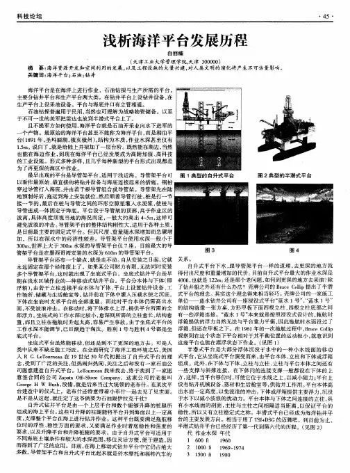 1.1固定式钻井平台的特点及应用目前,深海石油开发成为关注的热点,浮式生产储存卸货平台(FPSO)因其独特优点而备受世界石油公司青睐,并开始大规模的应用。