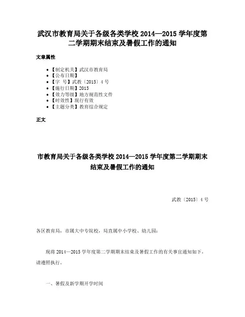武汉市教育局关于各级各类学校2014—2015学年度第二学期期末结束及暑假工作的通知文章属性•【制定机关】武汉市教育局•【公布日期】•【字号】武教〔2015〕4号•【施行日期】2015•【效力等级】地方规范性文件•【时效性】现行有效•【主题分类】教育综合规定正文市教育局关于各级各类学校2014—2015学年度第二学期期末结束及暑假工作的通知武教〔2015〕4号各区教育局,市属大中专院校,局直属中小学校、幼儿园:现将2014—2015学年度第二学期期末结束及暑假工作的有关事宜通知如下,请遵照执行。