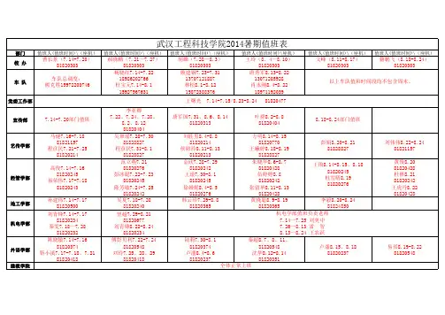 XX学院2013—2014学年度第二学期暑假值班安排一、政务值班安排政务值班人员职责一、假期中院领导为值班的带班领导,实行电话值班,重点检查部门值班的安排落实情况和值班人员在岗工作情况,同时对重要事项做出安排处理等。