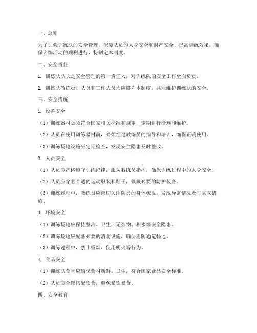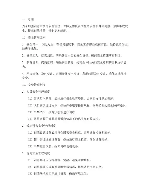 一、总则为了加强训练队的安全管理,保障队员的人身安全和财产安全,提高训练效果,确保训练活动的顺利进行,特制定本制度。