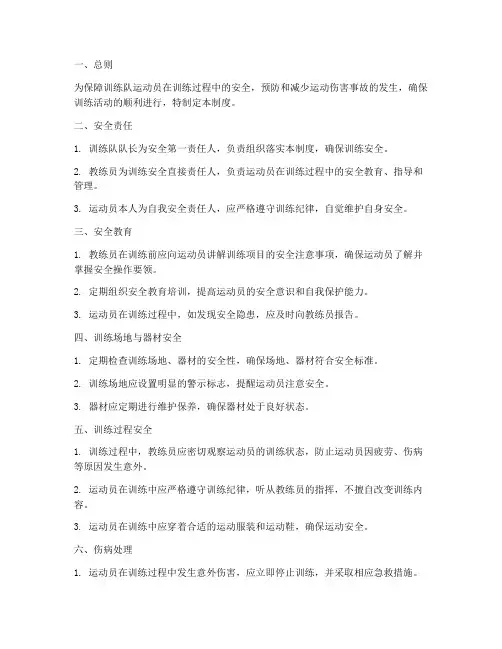 一、总则为保障训练队运动员在训练过程中的安全,预防和减少运动伤害事故的发生,确保训练活动的顺利进行,特制定本制度。