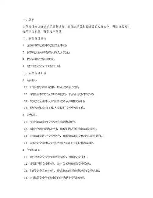 三、安全管理职责1. 运动员:(1)严格遵守训练纪律,服从教练员安排;(2)掌握基本的安全知识和技能,提高自我保护意识;(3)发现安全隐患及时报告教练员和相关部门;(4)配合教练员和工作人员做好安全管理工作。