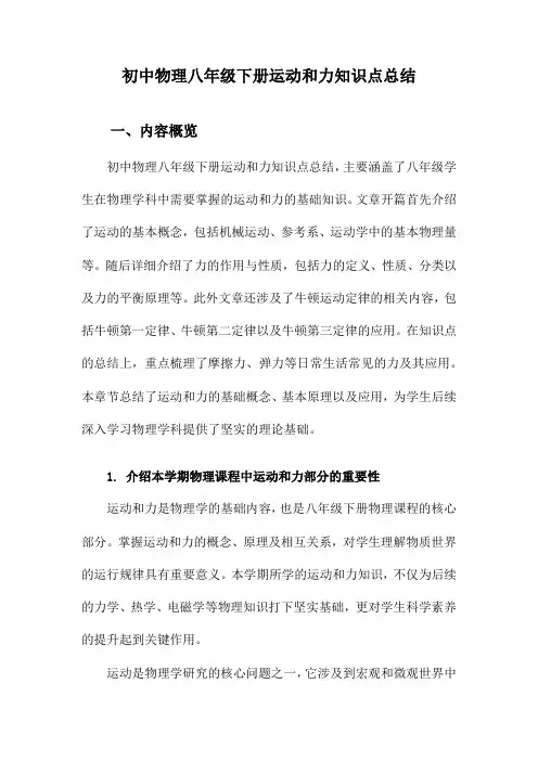 初中物理八年级下册运动和力知识点总结一、内容概览初中物理八年级下册运动和力知识点总结,主要涵盖了八年级学生在物理学科中需要掌握的运动和力的基础知识。