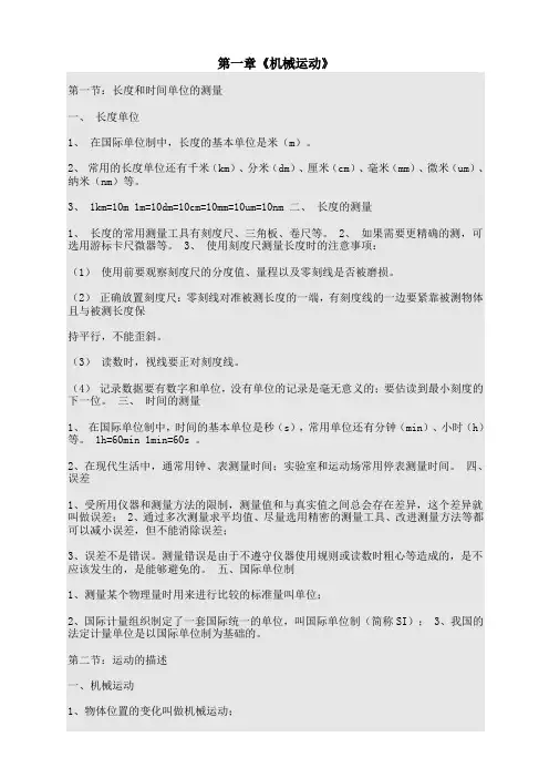第一章机械运动(笔记)第1节长度和时间的测量1、长度单位:长度的国际单位是米,符号m。