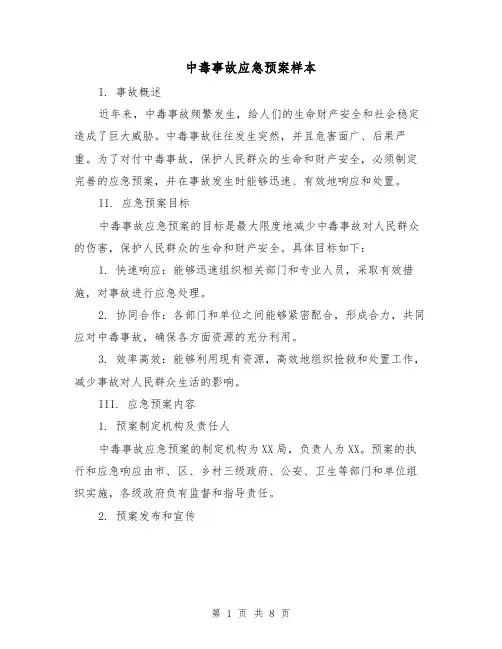中毒事故应急预案范文一、事故概述中毒事故是指人体因吸入、摄入或接触某种有毒物质而导致中毒的突发事件。