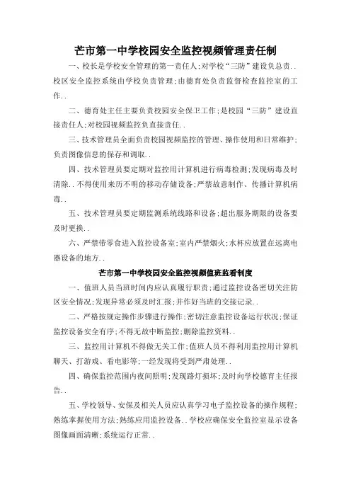 芒市第一中学校园安全监控视频管理责任制一、校长是学校安全管理的第一责任人;对学校“三防”建设负总责.. 校区安全监控系统由学校负责管理;由德育处负责监督检查监控室的工作..二、德育处主任主要负责校园安全保卫工作;是校园“三防”建设直接责任人;对校园视频监控负直接责任..三、技术管理员全面负责校园视频监控的管理、操作使用和日常维护;负责图像信息的保存和调取..四、技术管理员要定期对监控用计算机进行病毒检测;发现病毒及时清除..不得使用来历不明的移动存储设备;严禁故意制作、传播计算机病毒..五、技术管理员要定期监测系统线路和设备;超出服务期限的设备要及时更换..六、严禁带零食进入监控设备室;室内严禁烟火;水杯应放置在远离电器设备的地方..芒市第一中学校园安全监控视频值班监看制度一、值班人员当班时间内应认真履行职责;通过监控设备密切关注防区安全情况;发现异常必须及时汇报;并作好当班的交接记录..二、严格按规定操作步骤进行操作;密切注意监控设备运行状况;保证监控设备安全有序;不得无故中断监控;删除监控资料..三、监控用计算机不得做无关工作;值班人员不得利用监控用计算机聊天、打游戏、看电影等;一经发现将受到严肃处理..四、确保监控范围内夜间照明;发现路灯损坏;及时向学校德育主任报告..五、学校领导、安保及相关人员应认真学习电子监控设备的操作规程;熟练掌握使用方法;熟练应用监控设备..学校应确保安全监控室显示设备图像画面清晰;系统运行正常..六、校区内突发停电或监控系统故障;导致监控系统不能正常工作;值班领导应第一时间上报学校;同时应安排人员加强校内安全巡检;并及时组织人员修理;排除故障..七、如发现校外人员强制入侵如翻越校区围墙;值班领导应立即上报主管领导;并组织值班教师、门卫人员到现场阻止入侵;问询入侵原因;做相关记录..学校视情节严重程度决定是否通知公安机关或报警..芒市第一中学校园安全监控视频图像信息保存使用登记制度一、校园监控系统图像实行自动保存;图像保存时间不少于15天..二、外来人员需要查看监控图像需经主管领导批准;填写监控信息图像查看记录表;对图像信息的内容、调取时间、调取用途等事项进行登记..三、任何人不得擅自复制、查询或者向公安机关以外的其他单位和个人提供、传播图像信息..四、任何人不得擅自删除、修改监控系统的运行程序和记录..五、任何人不得擅自改变公共安全图像信息系统的用途和摄像设备的位置..六、任何人不得干扰、妨碍监控系统的正常运行..。