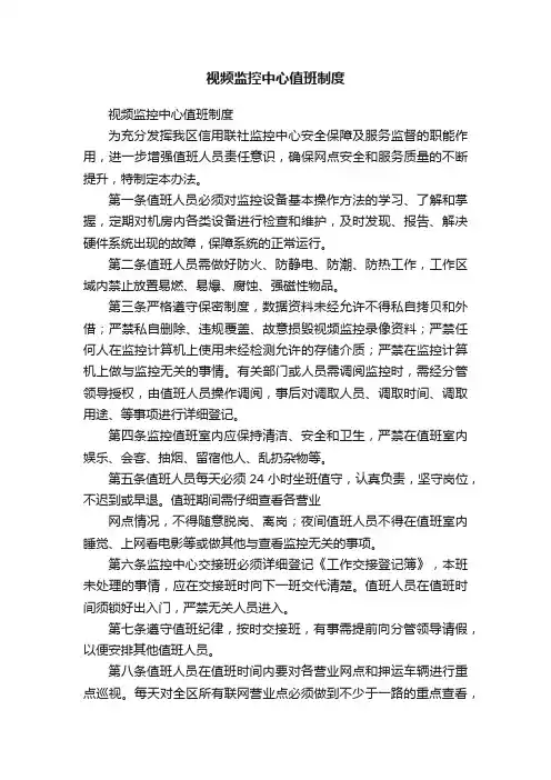视频监控中心值班制度视频监控中心值班制度为充分发挥我区信用联社监控中心安全保障及服务监督的职能作用,进一步增强值班人员责任意识,确保网点安全和服务质量的不断提升,特制定本办法。