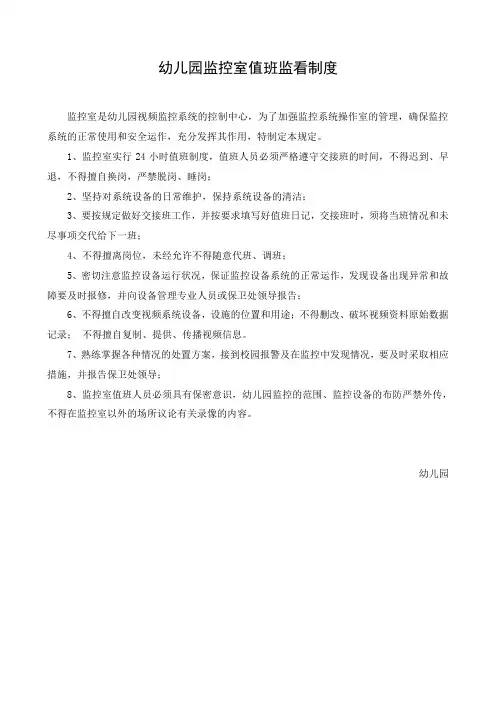 二、适用范围本制度适用于幼儿园内的视频监控系统,包括幼儿园内的各个区域、通道、出入口等。