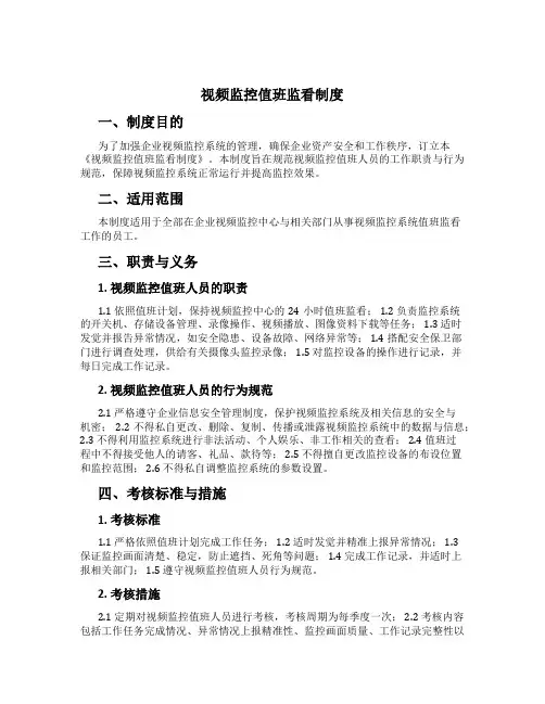 二、适用范围本制度适用于全部在企业视频监控中心与相关部门从事视频监控系统值班监看工作的员工。