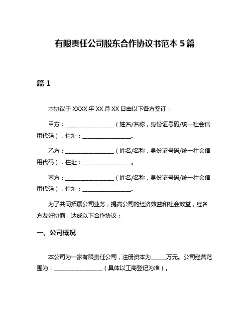 有限责任公司股东合作协议书5篇篇1本协议于XXXX年XX月XX日由以下各方在此签署:甲方:[公司名称](以下简称“公司”),法定代表人:[姓名],注册地址:[地址]。