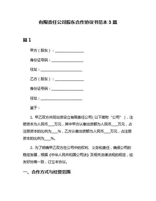 有限责任公司股东合作协议范本5篇篇1甲方(股东一):___________,身份证号码:_______________________,联系方式:______________;乙方(股东二):___________,身份证号码:_______________________,联系方式:______________;丙方(股东三):___________,身份证号码:_______________________,联系方式:______________;经上述股东各方经过友好协商,共同出资设立有限责任公司(以下简称“公司”),就设立公司之相关事宜达成如下协议:一、协议宗旨各方本着风险共担、利益共享的原则进行合作。