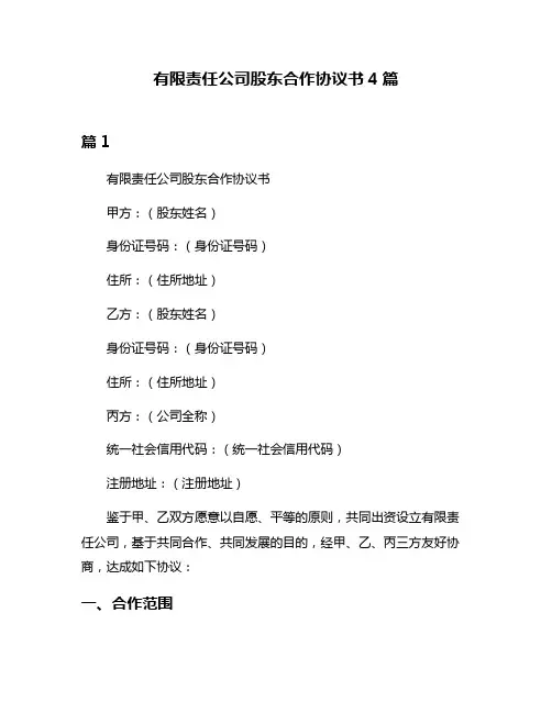 有限责任公司股东合作协议书4篇篇1有限责任公司股东合作协议书甲方:(股东姓名)身份证号码:(身份证号码)住所:(住所地址)乙方:(股东姓名)身份证号码:(身份证号码)住所:(住所地址)丙方:(公司全称)统一社会信用代码:(统一社会信用代码)注册地址:(注册地址)鉴于甲、乙双方愿意以自愿、平等的原则,共同出资设立有限责任公司,基于共同合作、共同发展的目的,经甲、乙、丙三方友好协商,达成如下协议:一、合作范围1. 甲、乙共同出资设立有限责任公司,合作期限为(具体合作期限)年,公司经营范围为(具体经营范围)。
