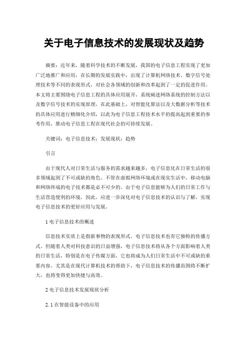 关键字:电子信息技术;发展现状;发展趋势引言当今世界,信息技术迅猛发展,全球一体化趋势日趋明显。