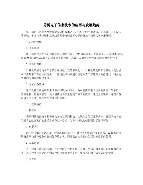 一、应用领域1.通讯领域电子信息技术在通讯领域的应用非常广泛,包括移动通讯、卫星通讯、互联网通讯等。