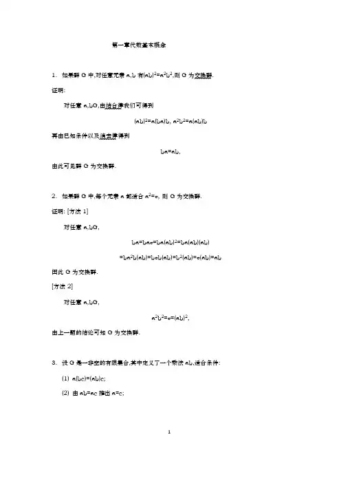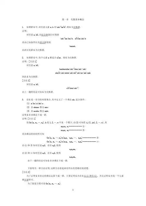 第一章代数基本概念1.如果群G中,对任意元素a,b有(ab)2=a2b2,则G为交换群.证明:对任意a,b∈G,由结合律我们可得到(ab)2=a(ba)b, a2b2=a(ab)b再由已知条件以及消去律得到ba=ab,由此可见群G为交换群.2.如果群G中,每个元素a都适合a2=e, 则G为交换群.证明: [方法1]对任意a,b∈G,ba=bae=ba(ab)2=ba(ab)(ab)=ba2b(ab)=beb(ab)=b2(ab)=e(ab)=ab因此G为交换群.[方法2]对任意a,b∈G,a2b2=e=(ab)2,由上一题的结论可知G为交换群.3.设G是一非空的有限集合,其中定义了一个乘法ab,适合条件:(1)a(bc)=(ab)c;(2)由ab=ac推出a=c;(3)由ac=bc推出a=b;证明G在该乘法下成一群.证明:[方法1]设G={a1,a2,…,a n},k是1,2,…,n中某一个数字,由(2)可知若i≠j(I,j=1,2,…,n),有a k a i≠a k a j------------<1>a i a k≠a j a k------------<2>再由乘法的封闭性可知G={a1,a2,…,a n}={a k a1, a k a2,…, a k a n}------------<3>G={a1,a2,…,a n}={a1a k, a2a k,…, a n a k}------------<4>由<1>和<3>知对任意a t∈G, 存在a m∈G,使得a k a m=a t.由<2>和<4>知对任意a t∈G, 存在a s∈G,使得a s a k=a t.由下一题的结论可知G在该乘法下成一群.下面用另一种方法证明,这种方法看起来有些长但思路比较清楚。