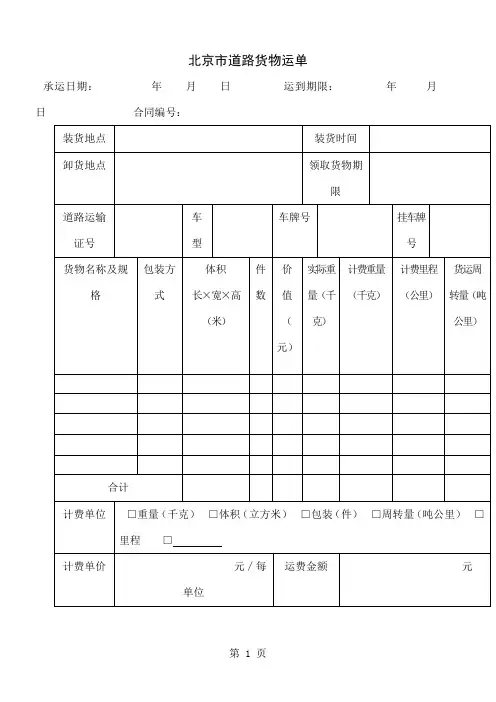编号: ___________________ 北京市道路货物运输单甲方:____________________乙方:____________________签订日期:____年____月____日?承运日期:年月日运到期限:年月日合同编号:装货地点装货时间卸货地点领取货物期限道路运输证号车型车牌号挂车牌号货物名称及规格包装方式体积长×宽×高米件数价值元实际重量千克计费重量千克计费里程公里货运周转量吨公里合计计费单位□重量千克□体积立方米□包装件□周转量吨公里□里程□计费单价元∕每单位运费金额元其他杂费货物名称及规格金额元保价费元保险费元备注费目金额元装卸费过路费过桥费结算方式□现金□支票□电汇□转账□对方付款□月结□运杂费合计万千百拾元角分¥:违约责任:1托运人未按约定的时间和要求提供托运货物的,每逾期一日应向承运人支付违约金元;2承运人未按约定的时间和要求配车、发运的,每逾期一日应向托运人支付违约金元;3未办理保价或保险运输的,货运事故赔偿方式及费用:4货物逾期到达,每逾期一日承运人应赔偿托运人元违约金;5收货人未按合同规定的期限领取货物,每逾期一日收货人或托运人应向承运人支付保管费元。