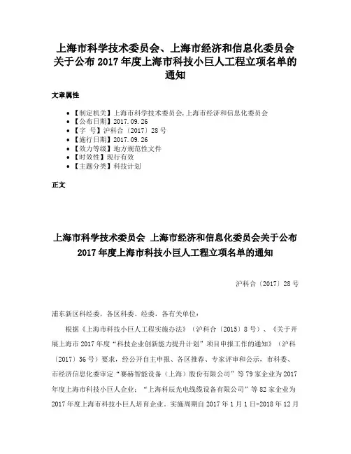 上海市科学技术委员会上海市经济和信息化委员会关于公布2017年度上海市科技小巨人工程立项名单的通知