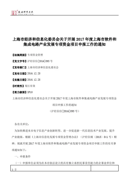 上海市经济和信息化委员会关于开展2017年度上海市软件和集成电路产业发展专项资金项目申报工作的通知【法规类别】专项资金管理【发文字号】沪经信信[2016]893号【发布部门】上海市经济和信息化委员会【发布日期】2016.12.28【实施日期】2016.12.28【时效性】现行有效【效力级别】XP10上海市经济和信息化委员会关于开展2017年度上海市软件和集成电路产业发展专项资金项目申报工作的通知(沪经信信[2016]893号)各有关单位:为加快推进本市电子信息产业创新转型,进一步促进新一代信息技术产业发展,提升产业能级,根据《上海市信息化发展专项资金管理办法》(沪经信规〔2015〕841号)精神,现就开展2017年度上海市软件和集成电路产业发展专项资金项目申报工作的有关事项通知如下:一、申报条件(一)申报单位必须为在本市依法设立的具有独立承担民事责任能力的企事业单位和社会组织,且内部治理结构完善,财务管理制度健全,信用状况良好;(二)申报的项目内容必须在项目指南范围内;(三)申报单位必须实事求是、科学合理地填报需实现的相关经济、技术指标以及资金落实情况;(四)项目实施周期在两年内(2017.4.1-2019.3.31);二、支持标准(一)软件和信息服务业领域1、产业发展类项目专项资金支持额度一般不超过项目总投资的30%,最高不超过800万元。