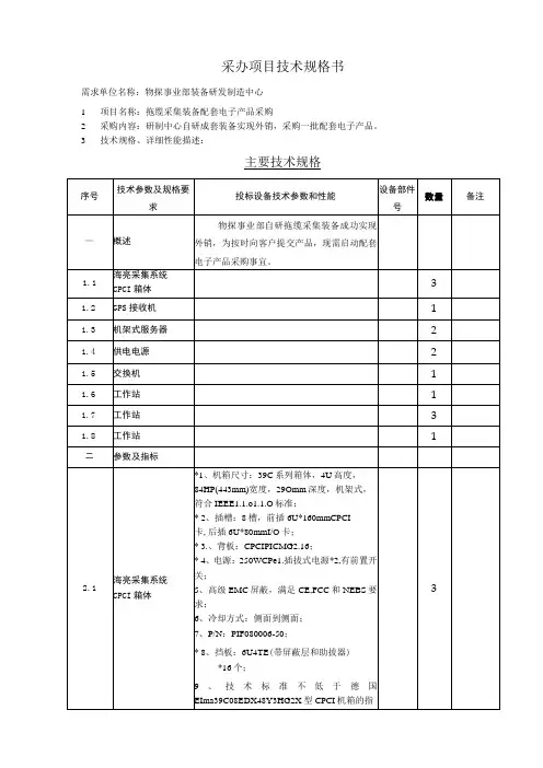 预估采购数量:1.1电气性能指标要求POI电气性能指标要求应满足表1.1-1、表1.1-2、表1.1-3、表1.1-4、表1.1-5、表1.1-6、表1.1-7要求:表1.1-1 6频POI电气性能指标要求表1.1-2 8频POI电气性能指标要求表1.1-3 9频POI电气性能指标要求表1.1-4 12频POI电气性能指标要求表1.1-5 4频POI(移动+联通)电气性能指标要求表1.1-6 4频POI(移动+电信)电气性能指标要求表1.1-7 4频POI(电信+联通)电气性能指标要求2端口要求2.1信源端端口要求POI信源端端口要求能覆盖输入系统的上下行频段,应满足表2.1-1、表2.1-2、表2.1-3、表2.1-4、表2.1-5、表2.1-6、表2.1-7要求:表2.1-1 6频POI信源端端口要求表2.1-2 8频POI信源端端口要求表2.1-3 9频POI信源端端口要求表2.1-4 12频POI信源端端口要求表2.1-5 4频POI(移动+联通)信源端端口要求表2.1-6 4频POI(移动+电信)信源端端口要求表2.1-7 4频POI(电信+联通)信源端端口要求2.2天馈端端口要求POI的天馈端端口采用双输出口,应满足表2.2-1要求:表2.2-1 POI天馈端端口要求2.3端口排列原则1)输入输出分开2)优先按运营商分列排布3)不能按照1)操作时,按系统集中排布4)端口之间保持一定的空间距离,便于外接馈线2.4多设备端口原则POI在需要和其它设备,包括POI自身,进行多设备组网共用时,端口/接口需要统筹整体考虑,比如POI需和干放、光放、监控、UPS以及其他等设备共用时,接口要求如下:1)同一种接口出头方向统一,不能有的射频端口后出,有的前出等;2)监控接口方向统一、位置统一、类型统一;3)同种设备接头规格统一。
