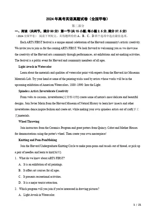 2024年高考英语真题试卷(全国甲卷)第二部分一、阅读 (共两节,满分50分) 第一节(共15小题;每小题2.5分,满分37.5分)(2024·全国甲卷)阅读下列短文,从每题所给的A、B、C、D四个选项中选出最佳选项。