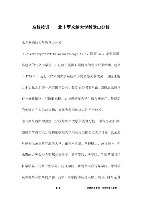 名校校训——北卡罗来纳大学教堂山分校北卡罗来纳大学教堂山分校(UniversityofNorthCarolinaatChapelHill,简写UNC)是美国最早建立的公立大学之一。