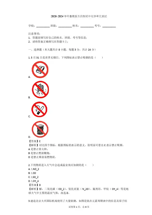 2023-2024学年鲁教版五四制初中化学单元测试学校:__________ 班级:__________ 姓名:__________ 考号:__________注意事项:1.答题前填写好自己的姓名、班级、考号等信息;2.请将答案正确填写在答题卡上;一、选择题(本大题共计8小题,每题3分,共计24分)1. 5月 31日是世界无烟日,下列图标表示禁止吸烟的是()A.B.C.D.【答案】C【解析】对比四个图标,根据图标的表示的意义,很明显可看出 C表示禁止吸烟。
